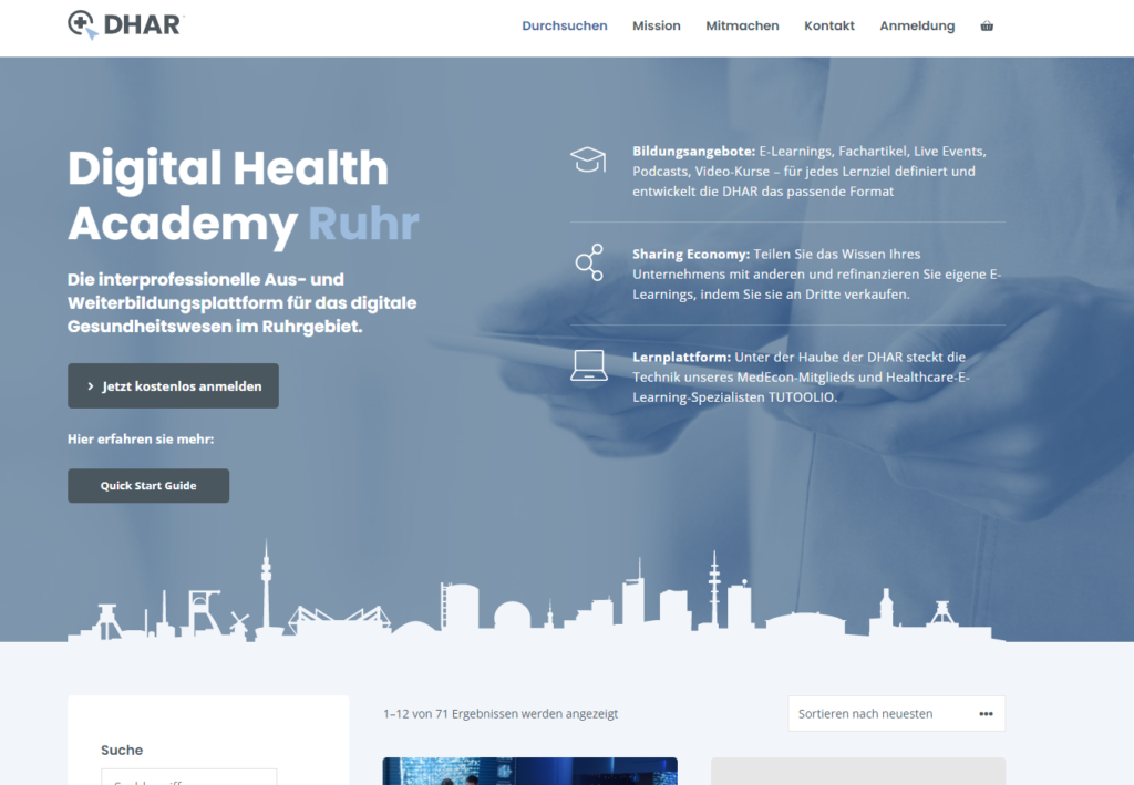 Medecon.Ruhr ist ein Netzwerk an der Ruhr, das gut 180 Krankenhäuser, Hochschulen, wissenschaftliche Einrichtungen und Unternehmen der Gesundheitswirtschaft verbindet. Viele der Mitgliedseinrichtungen klagten über ein identisches Problem: Sie suchten, kauften oder produzierten weitgehend gleiche Weiterbildungsangebote – jeder für sich. Medecon.Ruhr trat mit der Vision an TUTOOLIO heran, den Mitgliedern eine Plattform zu bieten, über die alle Mitglieder vielfältige Informationen, Weiterbildungen, Webinare und Veranstaltungen der Gesundheitswirtschaft bequem und kostengünstig bereitstellen und beziehen können. Im Januar 2022 wurde die Digital Health Academy Ruhr gelauncht. Neben den ersten rund 70 Kursen entwickelt sich inzwischen im Hintergrund ein Netzwerk von Knwo-how- und Lerntech-Anbietern, die verschiedene Beratungs- und Lernangebote gemeinsam entwickeln.